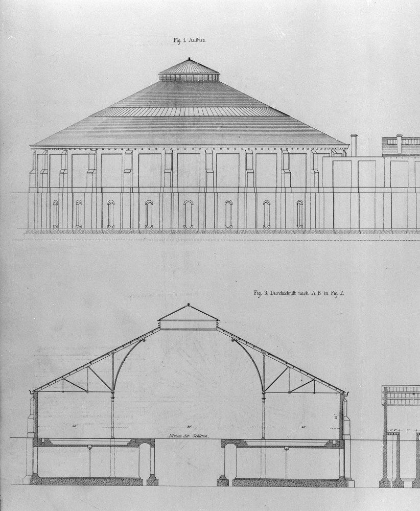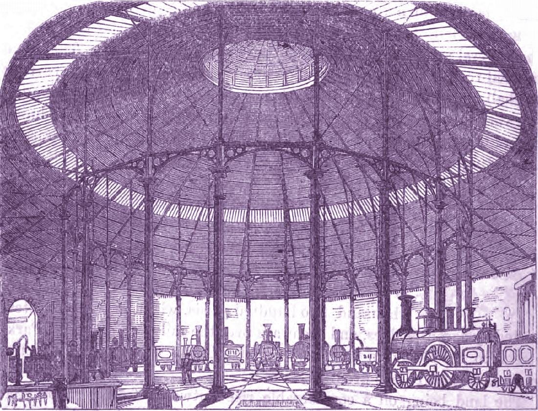 “It was so well designed that not a brick, not a pillar, not a slate was wasted. Everything did its job in the most economical way possible. Below were brick vaults which raised the turntable and engine storage bays to the railway level. Simple, functional and not used at first for any other purpose, such as for storage or stables. In the centre of the railway level was the circular turntable leading to bays of similar length all round. These were surrounded by a circular brick wall and a circle always encloses the largest area for the fewest bricks. No wasted corners or land. Above was a conical roof requiring the smallest quantity of timber as rafters and the fewest slates. Above again was an open lantern, so that the hot air and steam would rise and escape, giving natural ventilation.”