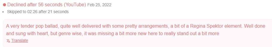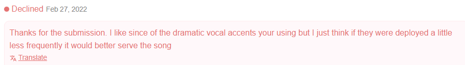 Other times, criticism hits you at the wrong time. After releasing my solo record, Hex Sign, I solicited feedback from music curators. The record was complete—mixed, mastered, and released. I had no more money to market or rework the project, so requesting critiques from strangers wasn’t the right move. I didn’t have an audience, so I was just hoping to potentially find one. The feedback I received was pretty hard to hear at this stage. Here are a few critiques I received for some of the songs on my record.
