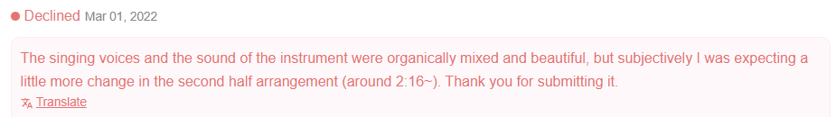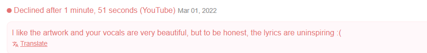 Feedback, for me, is what I might ask for before a song is completed, while I have time to change it. Once it’s out there… I’m much less interested in criticism because music is so *subjective*. When I read the criticisms of your song that you posted, what’s missing are the words “I think”, or “For me” ahead of the comments. A good constructive critic should appreciate the distinction between subjective and objective comments!