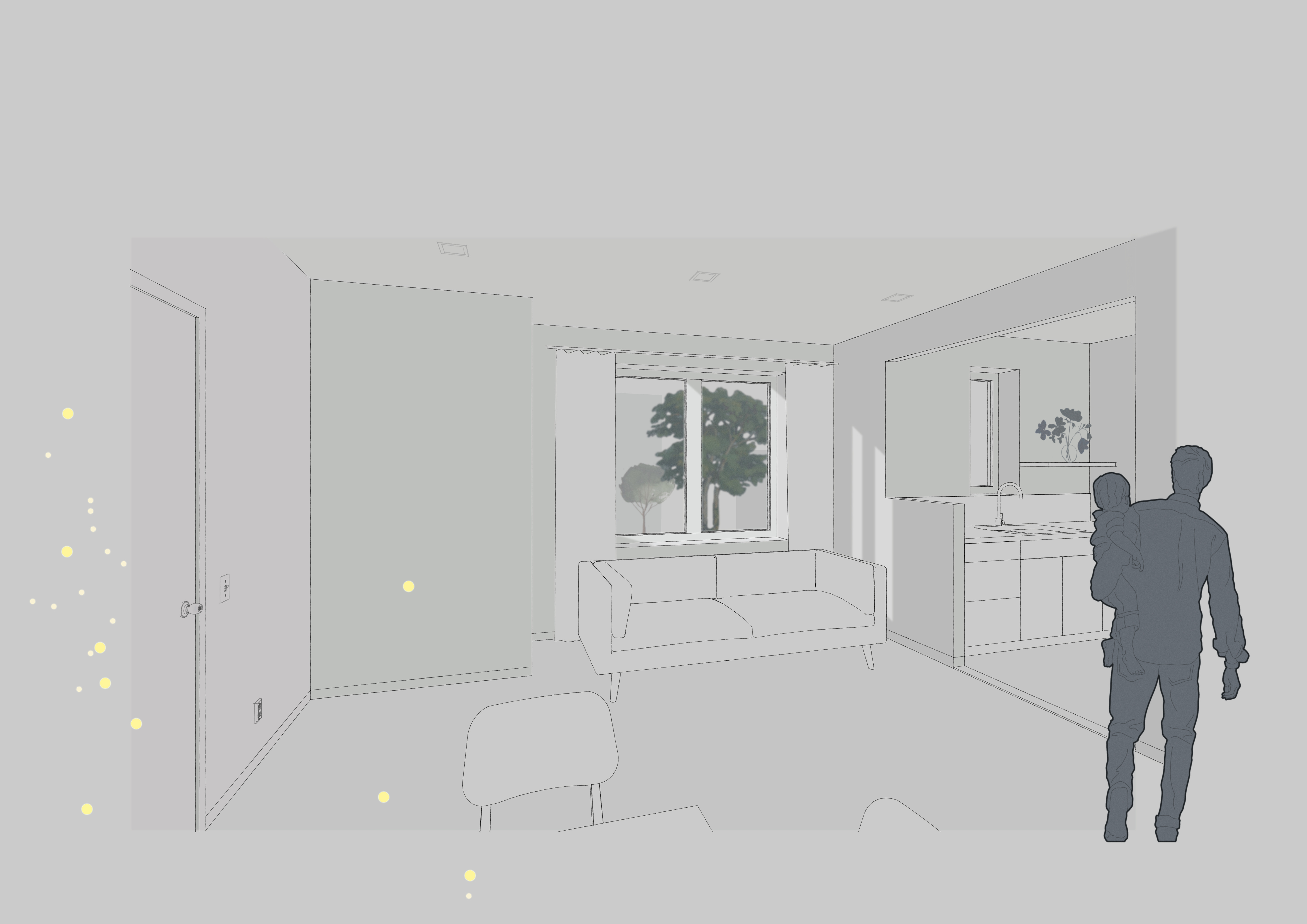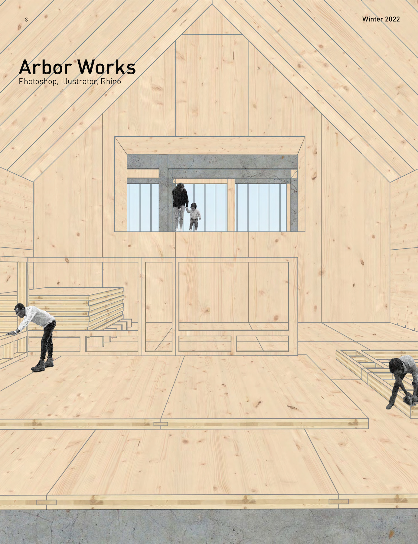 At work, I am dusting off the old photoshop and illustrator skills. Some projects call for a different hand than contemporary rendering services can provide. I tend to favor a less realistic rendering than most softwares are designed to produce. I often collage materials and linework together to create a new environment. This is an example of my rendering style.